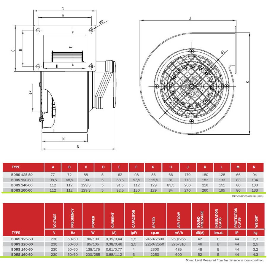 BVN BDRS-160-60 egyfázisú radiál centrifugál ventilátor 230V, 200W/255W, 52db, IP44, 600 m3/h, 2250 rpm.